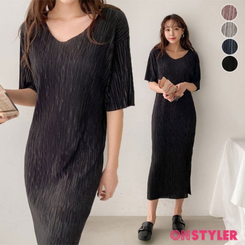 율블리샵 브이넥 매직주름 옆트임 반팔 롱 플리츠 원피스