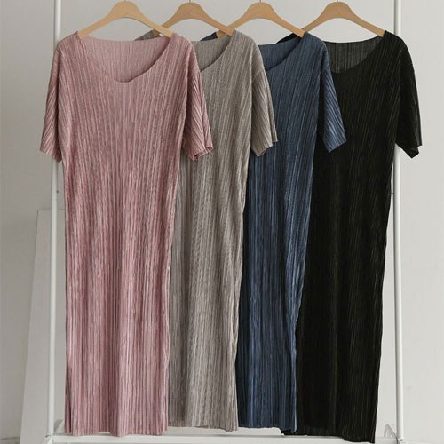 율블리샵 브이넥 매직주름 옆트임 반팔 롱 플리츠 원피스
