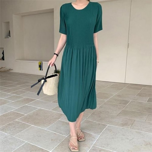 뉴욕멋쟁이 리버 브이 플리츠 롱원피스 여름원피스 반팔원피스 롱티원피스