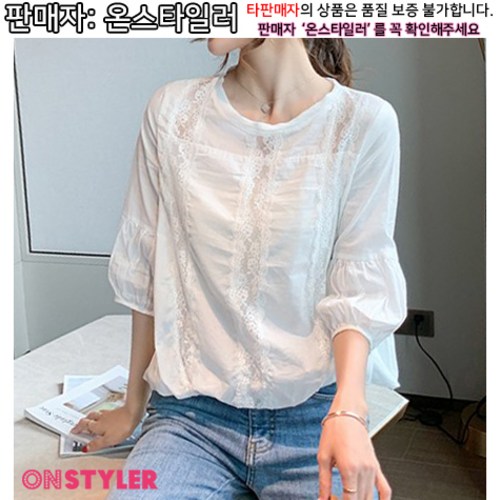 온스타일러 국내배송 백야 레이스 7부 블라우스 여성 화이트 라운드넥