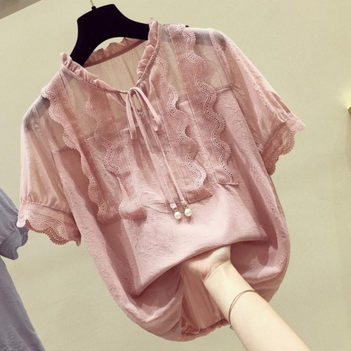 레이스 펀칭 프릴 자수 퍼프 블라우스