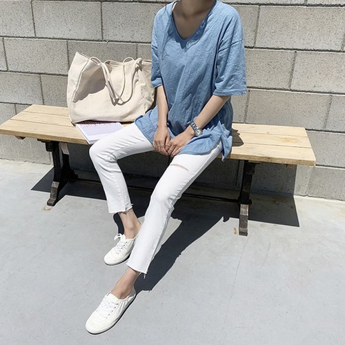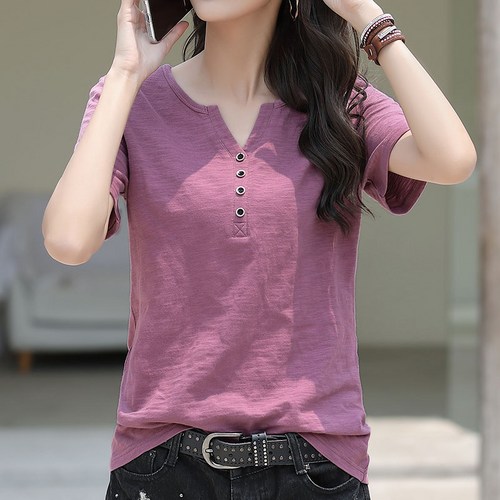 여름 여성 화이트 브이넥 빅사이즈 반팔티셔츠