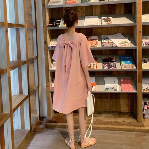 지포레 뒷 리본 포인트 루즈핏 핑크 원피스