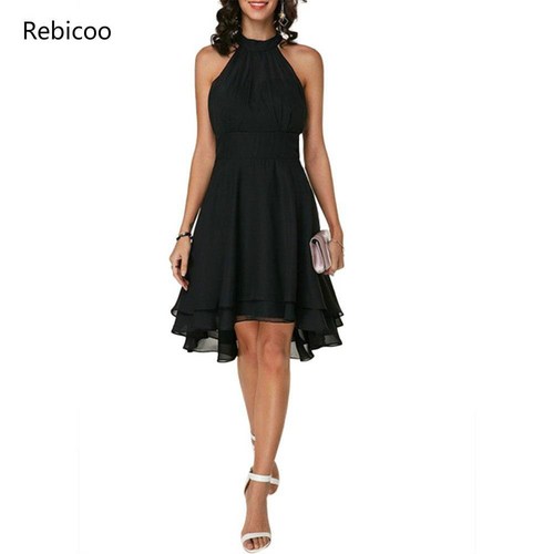 뜨거운 여성 패션 우아한 솔리드 컬러 소프트 홀터넥 민소매 비대칭 헴 원피스 드레스 선물