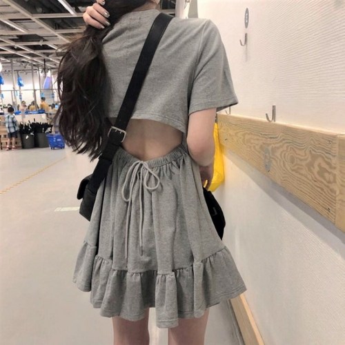 뒷트임 원피스 반팔 밑단프릴 반전 스트링 미니 등파임