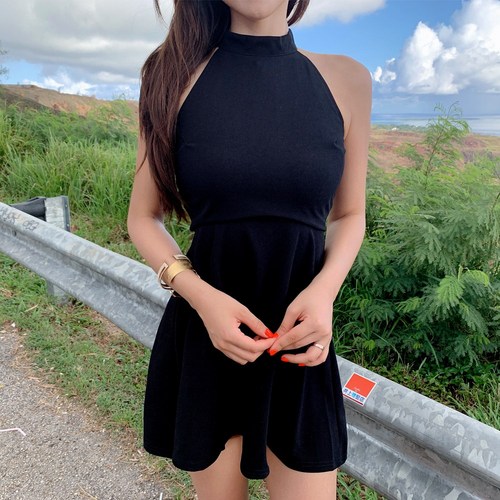 워너비제이 리빗 홀터넥 리본 플레어원피스