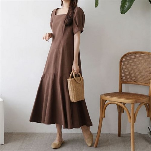 마쿠쿠 스퀘어넥 인견 반팔 여름 A라인 린넨 롱 원피스