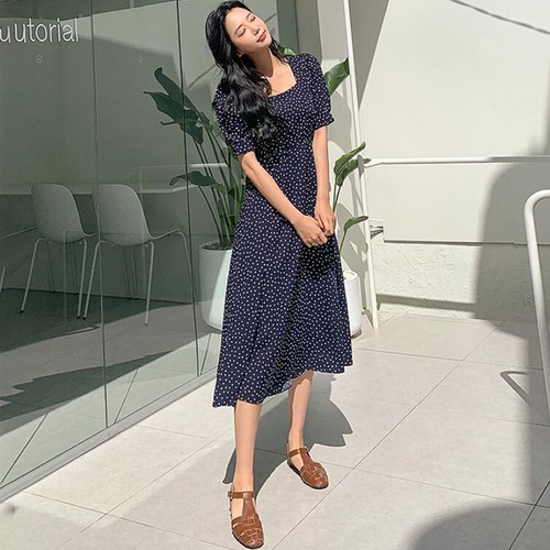 나날샵 스퀘어넥 원피스)미디 롱 원피스 롱원피스 원피스 봄원피스 반팔원피스 골지원피스 무지원피스