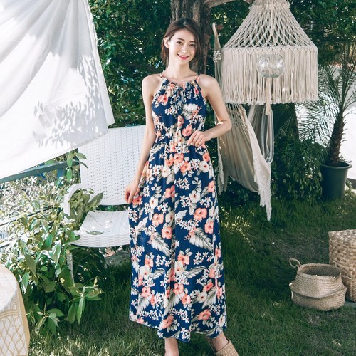 헤링본 롱 비치원피스 쉬폰 나시 여름 홀터넥 플라워 바캉스 비치웨어 휴양지룩 H236