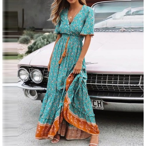 topcross 페이즐리 에스닉 비치 쉬폰 여름 롱 반팔 원피스