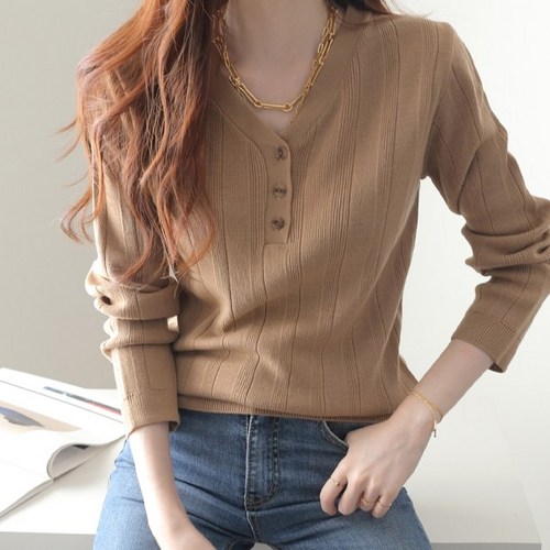 제니트 깔끔 단추 브이넥 니트 가을 여성