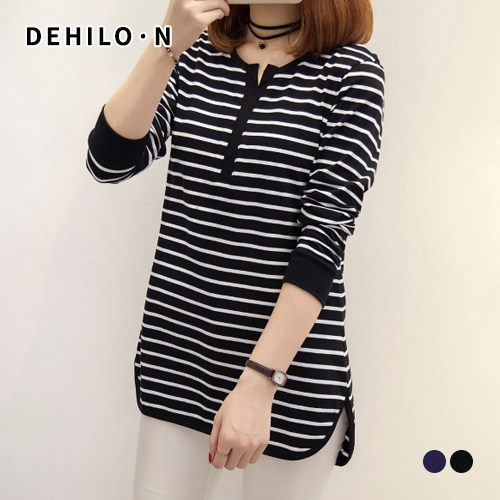 데일로엔 여성용 스트라이프 헨리넥 기본 가을 면티셔츠 긴팔 티셔츠