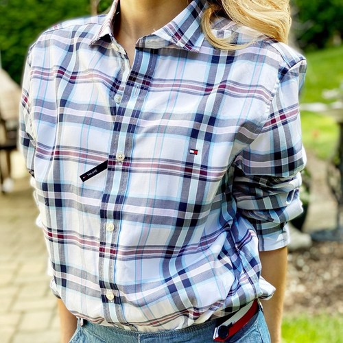 타미힐피거 남녀공용 THLUXE 핑크라인 포인트 타탄체크 긴팔 셔츠