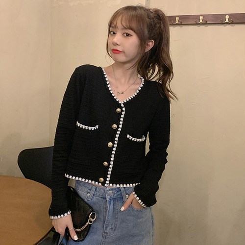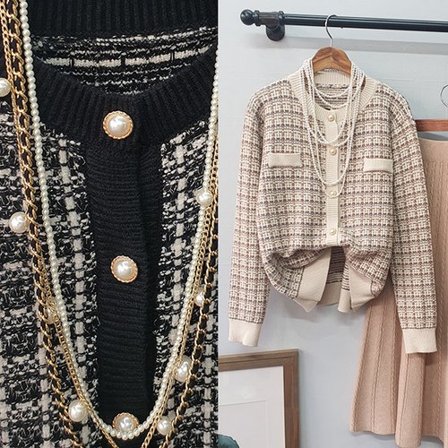 에이스토리 트위드 진주 버튼 니트 가디건