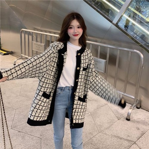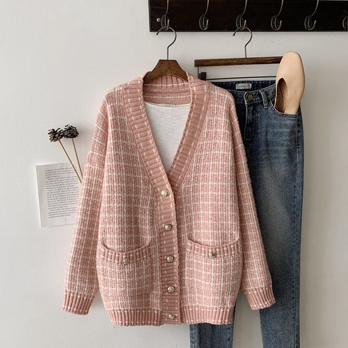 퐁순싸롱 체크 배색 자켓 트위드 니트 오버핏 가디건 YJ