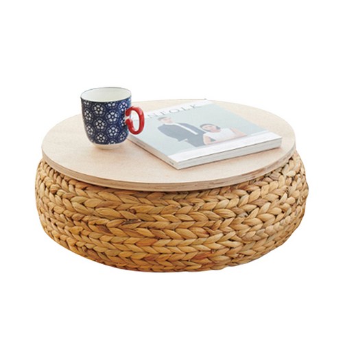 라탄 테이블 미니 좌식 티 테이블 세트, 테이블+2개 원형 방석 세트