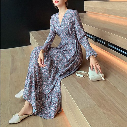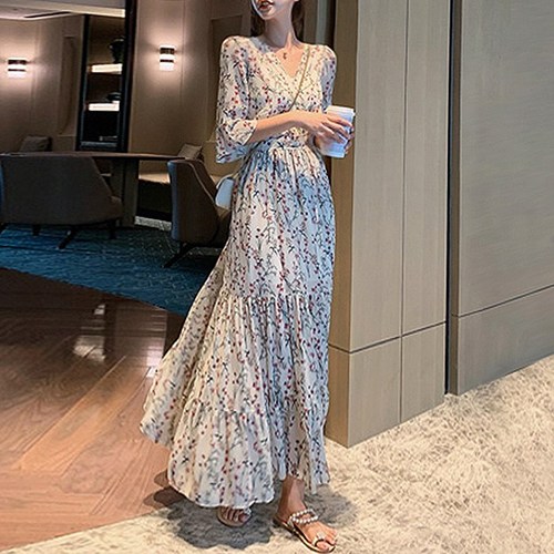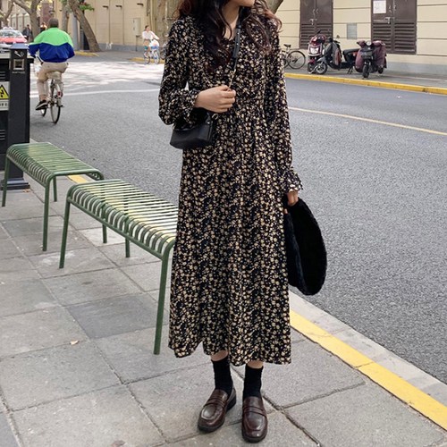 마쿠쿠 잔꽃 플레어 플라워 앞 셔링 쉬폰 롱 원피스