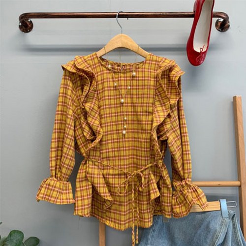바이미쓰리 / 체키레이스 허리끈 프릴 블라우스 (3color)