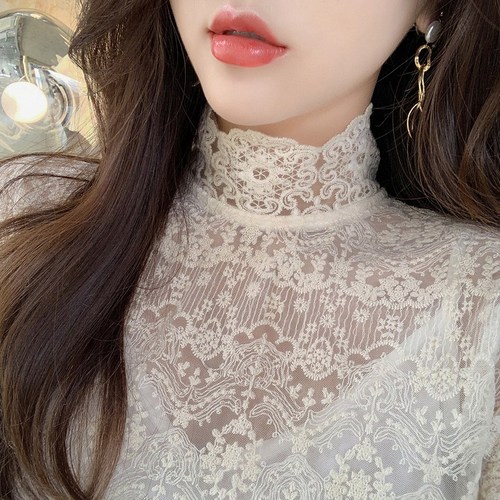 레이스 이너 셔츠 여성 겨울 가을 스웨터 이너웨어 블라우스 긴 소매 꽃자수 쇼트 망사 상의