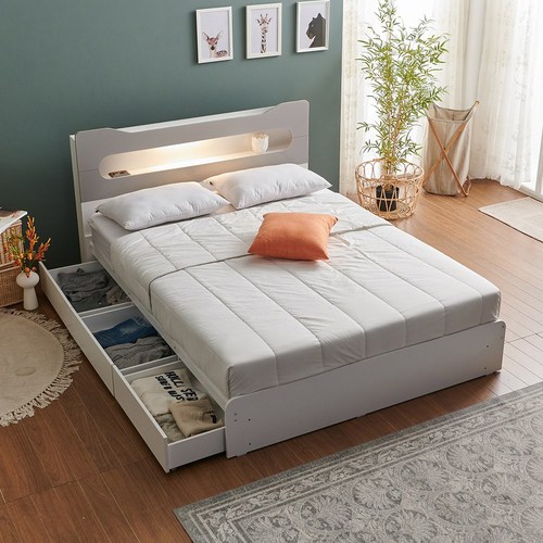 라자가구 RF 카인 LED 리노 서랍 슈퍼싱글/퀸 침대+베이직 본넬 매트리스, 화이트그레이