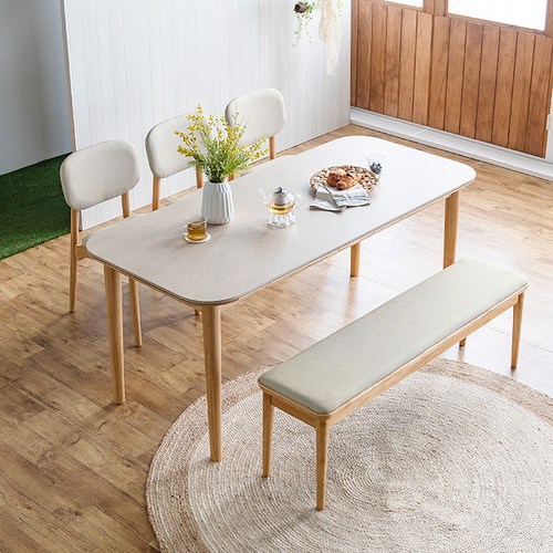 로드퍼니처 아몬 고무나무 원목 세라믹 식탁 + 의자 2p + 벤치 세트 4인용 1300 방문설치, 화이트
