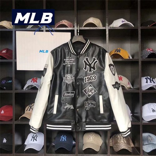 MLB 엠엘비 바람막이 자수 PU가죽 커플 야구점퍼